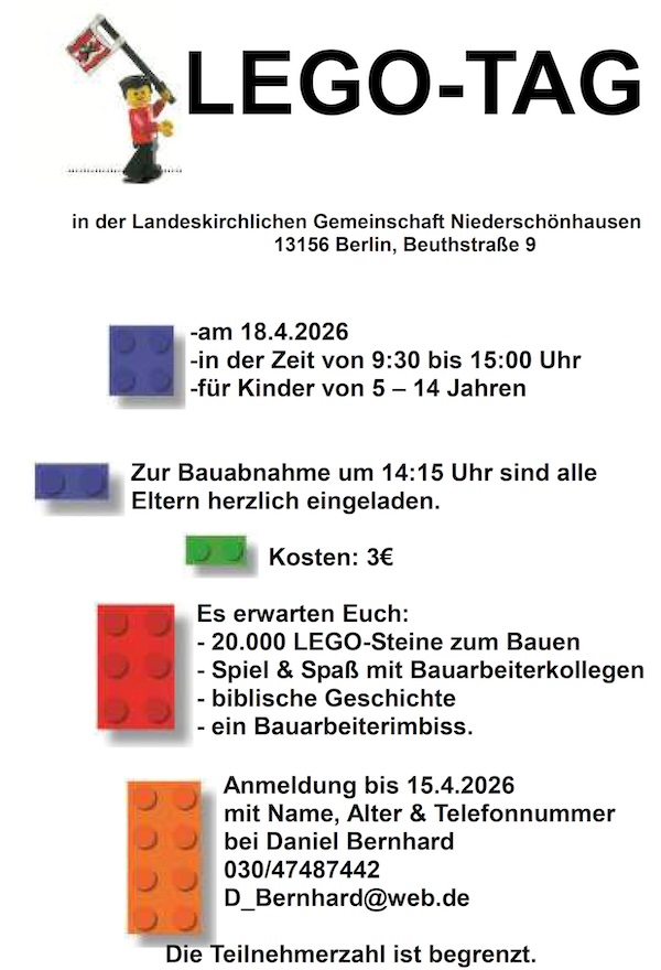 Während des Legotages werden Fotos aufgenommen, die im Rahmen unserer Gemeinschaftsarbeit genutzt werden können (z.B. Jahresrückblick, Freundesbrief, Einladungen zu ähnlichen Veranstaltungen).